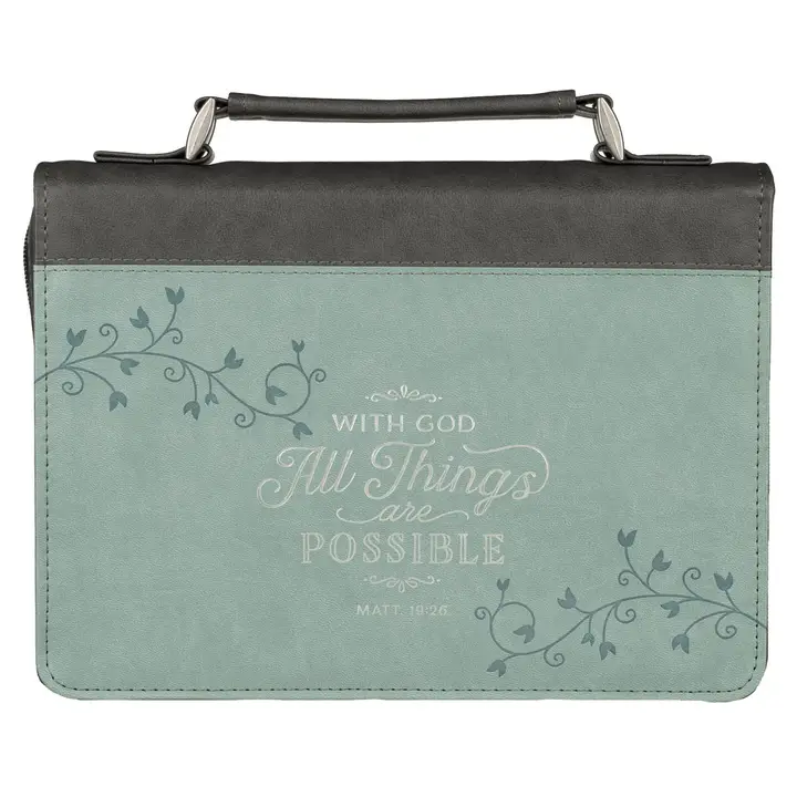 The All Things Are Possible Light Blue Faux Leather Classic Bible Cover is a stylish and contemporary way to carry your Bible to Sunday school or church. Heat-debossed twig design, Slate gray and light blue faux leather, Silver-foiled text, With God everything is possible, Matthew 19:26, Fashion Bible case, Exterior slip pocket, Silver cross-engraved zipper pull, 2Â interior pen loops
